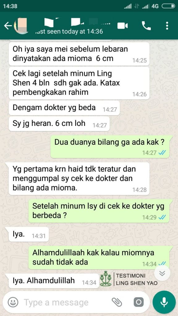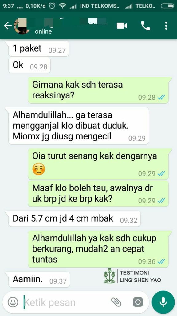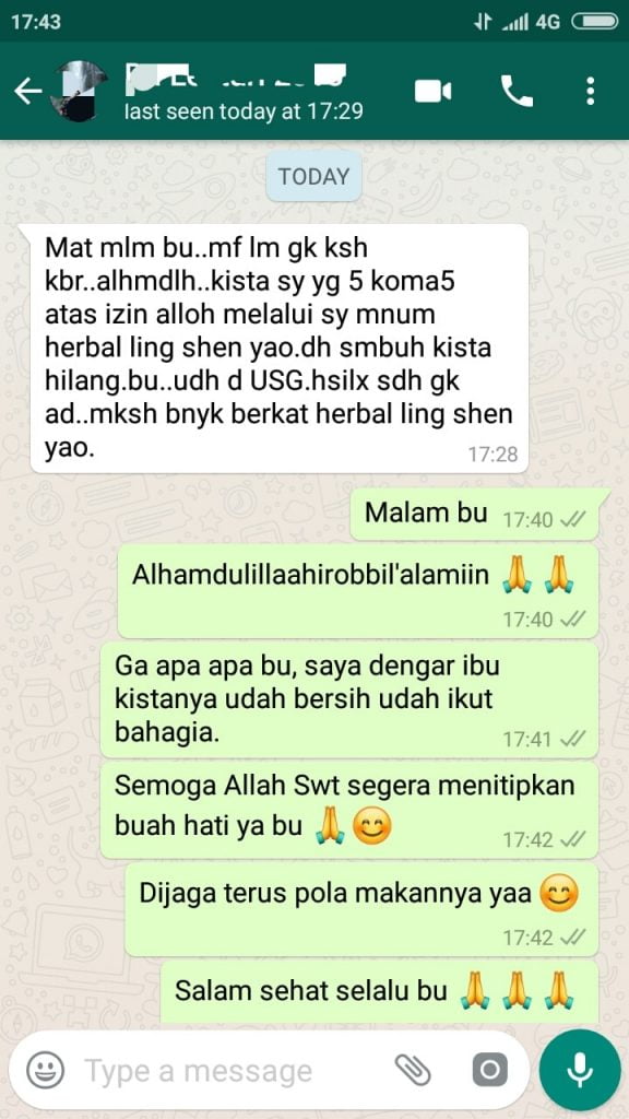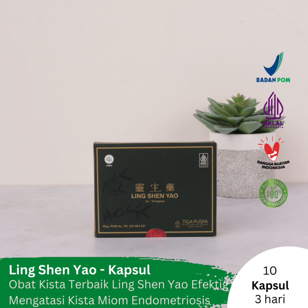 browsing di internet. Ia pun mendapatkan informasi efek samping obat tersebut yang mana salah satunya dapat memicu kanker payudara. Hal ini membuat ia takut dan memutuskan untuk mencari pengobatan alternatif yang lebih aman.Dalam satu kesempatan Ia menyampaikan keluhan tersebut kepada atasannya di kantor. Dan ia pun mendapatkan rekomendasi untuk mengkonsumsi Obat Herbal Ling Shen Yao. Obat herbal yang sudah membantu mengatasi berbagai penyakit di organ reproduksi kewanitaan mulai dari Kanker, Kista, Mioma dan lain sebagainya.“Kurang dari satu minggu mengkonsumsi Ling Shen Yao, saya merasakan perut melilit namun rasa sakit tersebut berangsur hilang bersamaan dengan keluarnya BAB. saya teruskan mengkonsumsi Ling Shen Yao. Kurang lebih 20 hari kemudian, menstruasi keluar. Alhamdulillah saya senang karena rasa begahnya berkurang seiring keluarnya darah haid. Setelah itu saya tidak mengkonsumsi Ling Shen Yao lagi karena saya pikir gangguan yang dialami sudah teratasi”, papar Dini.Lewat dari tujuh hari siklus normal yang biasanya ia dapat, darah masih saja keluar dengan volume yang sangat banyak setiap harinya. Awalnya ia pikir hal tersebut wajar karena darah tersebut merupakan darah yang tertahan karena haid yang tidak keluar. Namun lama kelamaan darah yang keluar makin banyak, berwarna merah segar sampai merah kehitaman disertai bentuk gumpalan dan serpihan. Lama kelamaan mulai terasa sakit di daerah pinggang, pinggul, pangkal paha lemas dan sedikit kram.Mengalami pendarahan yang cukup banyak dan rasa sakit yang mulai mengganggu maka ia kembali mengkonsumi Ling Shen Yao yang beberapa waktu sempat terputus. Malam sebelum tidur ia konsumsi obat tersebut, keesokan harinya, rasa sakit yang ia alami hilang, meskipun pendarahan masih terjadi tapi keluhan yang sebelumnya ia alami seperti diredam oleh obat tersebut sehingga tubuhnya tetap fit sehingga dapat beraktivitas seperti biasa.Pada tanggal 5 Januari 2015, ia memeriksan diri kembali ke dokter untuk konsultasi pendarahan yang ia alami hampir satu bulan lamanya. Obat Penghenti pendarahan dan penambah darah ia konsumsi berdampingan dengan Ling Shen Yao. Tanggal 17 Januari 2015, pendarahan pun dapat dihentikan.Sejak saat itu, siklus haid belum kembali normal karena mengatasi gangguan hormon memerlukan waktu yang cukup lama. Namun pada saat kontrol rutin ke dokter bulan Juli 2015, hasil USG menunjukkan penebalan dinding rahim berkurang signifikan, yaitu tinggal 7 mm. Terakhir diperiksa Bulan Oktober 2015, dokter menyatakan rahimnya sudah bersih, karena sudah tidak tampak penebalan lagi. “Syukur Alhamdulillah saya dinyatakan terbebas dari Endometriosis,” jelas Dini, bahagia.Hingga kini, Endometriosis belum diketahui sebabnya. Kesimpulan sementara menyebutkan bahwa asupan bahan makan yang kaya akan zat sintetis, radikal bebas pada lingkungan, serta pola hidup modern yang kurang sehat ditenggarai menjadi faktor dominan munculnya penyakit ini. Bagi para wanita, ada beberapa gejala yang patut diwaspadai pada fase awal kemunculan Ednometriosis yaitu nyeri saat haid, pinggang sakit saat duduk, panggul akan sering terasa nyeri, nyeri pada anus saat buang air besar, limpahan darah saat masa haid, penebalan vagina, sakit saat berhubungan intim, dan sakit perut seperti maag.