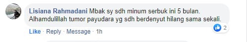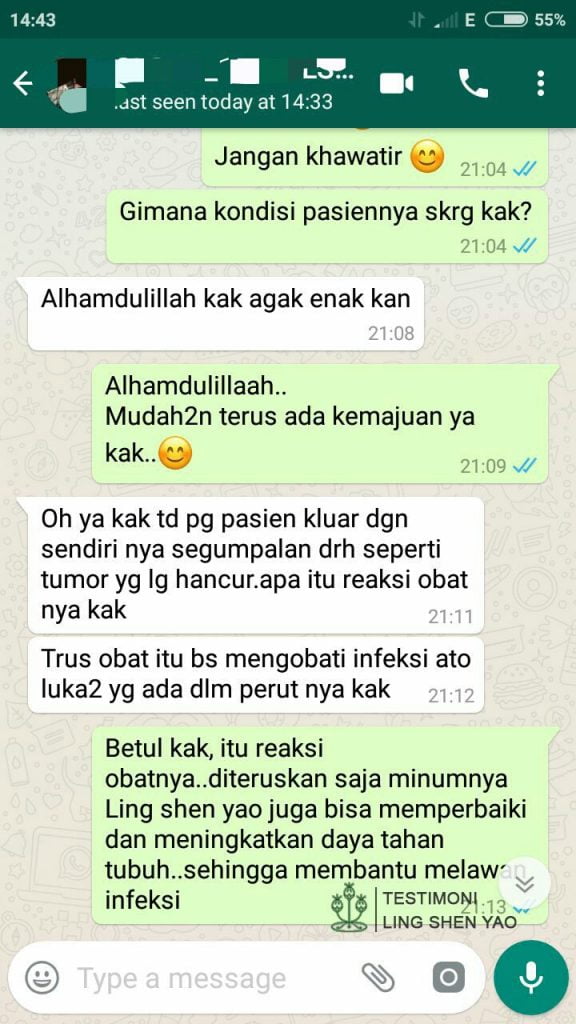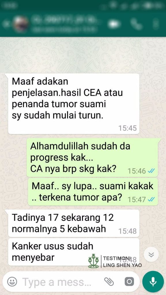 shock. Suami dan anak-anak juga para kerabat mulai mengkhawatirkan saya tidak akan berumur panjang akibat penyakit tersebut. Saya pun sempat membayangkan itu,” kata Rosna.“Dokter sebenarnya mengharuskan saya menjalani operasi. Namun saya tidak mau, takut terjadi hal-hal yang lebih buruk pada diri saya, karena terus terang saya takut menghadapi operasi. Untunglah para kerabat begitu bersimpati kepada saya, berupaya mencarikan obat untuk kesembuhan saya. Dalam kondisi yang sudah parah, dimana saya sudah terkapar tak berdaya di tempat tidur, terkadang menggigil kedinginan, terkadang malah kepanasan dan berbagai siksaan lainnya. Pokoknya saya sudah pasrah. Namun dalam kepasrahan itulah, April 2003 seorang kerabat membawakan saya Obat Herbal Ling Shen Yao. Baru seminggu minum obat tersebut, terjadi perubahan drastis dalam diri saya. Badan rasanya lebih enak, pikiran mulai tenang, mulai bisa tidur nyenyak dan selera makan pun membaik. Sejak itu lah saya konsumsi terus Ling Shen Yao dan menghentikan obat-obatan lain,” lanjut Rosna.Dari pembuangan lewat air seni, keluar kotoran seperti lender dan serpihan daging. Saya rasa, itulah tumor yang selama ini bersarang di rahim saya. Makin lama makin membaik. Seiring itu, benjolan di payudara seukuran bola bekel yang dideteksi dokter adalah kanker, tanpa disadari juga menyusut. Makin lama makin hilang, dan lenyap sama sekali,” kata Rosna.Dalam waktu tiga bulan saya rasakan, sepertinya saya hidup kembali dari kematian. Tubuh saya telah prima sebagaimana semula dan saya pun bisa beraktivitas kembali sebagaimana sebelumnya. Untuk membuktikan kesembuhan tersebut, saya periksakan diri ke rumah sakit dan dokter semula. Ternyata tumor di rahim saya sudah sembuh tanpa operasi. Begitupun benjolan di payudara saya juga lenyap seiring itu. Penasaran dengan pemeriksaan tersebut, saya menghadiri wisuda sarjana anak saya di Jakarta, saya periksakan diri ke rumah sakit yang lebih besar dengan peralatan yang lebih canggih. Hasilnya juga menyatakan, bahwa saya tidak mengidap tumor. Baik rahim maupun payudara saya bebas dari tumor,” kata Rosna.
